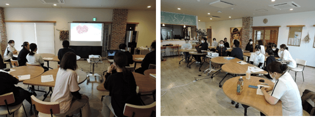 7つ目は「認知症看護」について、毎年出前研修を申し込みいただいている特別養護老人ホームで開催しました。介護施設では認知症高齢者の利用者が年々増加傾向にあり、様々な行動・心理症状への対応に苦慮する場面が多いことから、認知症の原因疾患や心理症状、その対処方法等について、ミニ・ロールプレイで学びました。